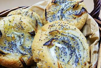 9) Una vez levadas las bolitas, aplastarlas con los dedos sólo en la parte centrar, poner en ese hueco la cebolla con su aceite y espolvorear con semillas de amapola.