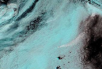 Las islas Sandwich del Sur, en el lejano Océano Atlántico meridional, están a menudo envueltas con espesas nubes, por lo que es difícil ver la región desde el espacio. A veces, sin embargo, pueden ser utilizadas imágenes en falso color para revelar los eventos que de otro modo quedarían ocultos bajo la cobertura de nubes.