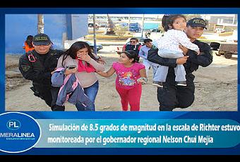 La simulación de 8.5 grados de magnitud en la escala de Richter estuvo monitoreada por el gobernador regional Nelson Chui Mejía, quien resaltó la rápida reacción y el orden mostrado en este tipo de emergencias.El gobernador regional de Lima – Nelson Chui Mejía – aplaudió que las autoridades y ciudadanía estén tomando conciencia para prepararse ante un posible terremoto.“Considero que la sensibilización debe empezar desde la niñez, para tener una actuación eficiente y oportuna en estos casos eventuales, reduciendo las cifras de muertes”, refirió la primera autoridad regional.Culminado el ejercicio, se instaló la Plataforma Regional de Defensa Civil y el grupo de trabajo en el Centro de Operaciones de Emergencia Regional (COER), en la sede institucional de Agua Dulce, donde el mandatario regional junto al Jefe de Defensa Civil Regional Lic. César Requejo Rodríguez, analizaron los reportes de evaluación de daños.