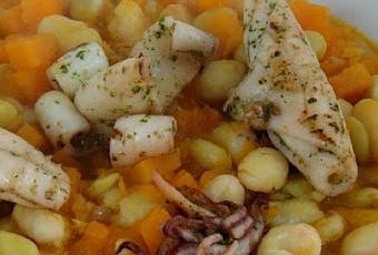 - Servir las pochas y poner unos chipirones por encima con parte de su aceite.