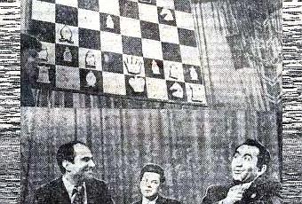 Retornemos ahora a nuestra partida comentada de hoy (siempre fijándonos en lo que los grandes maestros analizaron en la época), viendo antes una foto de una rueda de prensa tras una ronda de aquel 41º Campeonato de la U.R.S.S., en donde aparecía Tigran Petrosian al lado de Mikhail Tal, comentando ambos alguna incidencia para el público presente en un tablero mural: