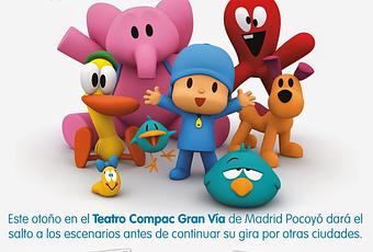 :: "Pocoyó y sus amigos" podrá verse en el Teatro Compac Gran Vía desde el 27 de septiembre, los sábados y domingos a las 12:00 horas. Promoción venta anticipada del 20% de descuento, hasta el 25 de septiembre. Los niños menores de 12 meses no pagarán entrada siempre no ocupen asiento.