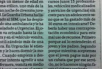 El doctor Miguel Gonzalez nos comparte la historia que da pie a esta reflexión. A un adolescente le sale más barata la borrachera que el uso de una unidad de urgencias y personal sanitario, no sanitario y de limpieza. No me planteo aquí juzgar la conducta de este joven, tan solo me hago una pregunta: ¿Sería adecuado pasarle la factura de estos gastos?