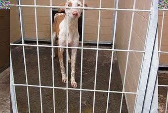 Podenco macho, se le ve que ha sufrido grandes malltratos, ya que está bastante asustado, deseoso de recibir caricias, pero con miedo de que en vez de cariño le caiga algún palo...