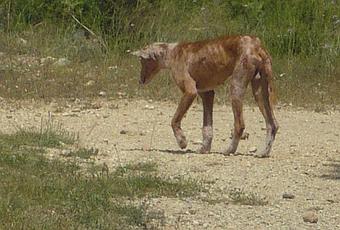 Este podenco, me lo encontré esta mañana, 12 de junio, cuando paseaba por causalidad por una urbanización cerca de Olocau Valencia.No digo exactamente donde por seguridad Nada más verlo, tan famélico y con heridas por todo su cuerpo fui a por agua y bebida, cuando intenté acercarme para dejarle la comida, se iba, está muy asustado, y huye de la gente, me fue imposible dejarle la comida cerca, es más no ha comido nada. No se fia de las personas y es imposible cogerlo, necesito gente que sepa como hacerlo. Por favor, si no hacemos algo se muere, he vuelto esta tarde para intentar cogerlo y nada, no se deja, pero lo bueno es que sigue allí. Lo malo es que es una urbanización un poco pija y temo por si le hacen algo. Estoy desesperada, no se que hacer por favor, ayudadme a difundir este caso, y a ver si podemos cogerlo y colocarlo en una casa de acogida.