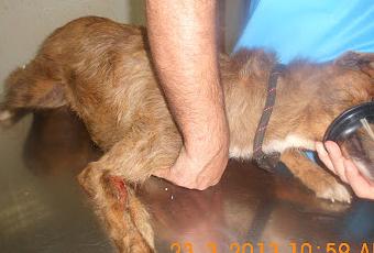 Este podenco recién operado y habiéndole extirpado un ojo debido a la brutal paliza, se ha escapado, tirando a la persona que lo saco a la calle.