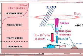 El dibujo ilustra campos magnéticos y eléctricos y magnéticos en una tormenta eléctrica y algunos de los fenómenos que se generan. Los TGFs pueden ser tan sólo un aspecto de la actividad de las tormentas eléctricas, además de los ELVES (Emisiones de Luz y Perturbaciones a muy baja frecuencia debidas a las fuentes de pulsos electromagnéticos), los sprites (grandes pero débiles destellos que aparecen directamente sobre una tormenta eléctrica y que son coincidentes con los potentes rayos positivos nube-tierra), los blue jets (un fenómeno óptico de gran altitud diferente a los sprites), además de los rayos "ordinarios". Crédito: Universidad de Stanford
