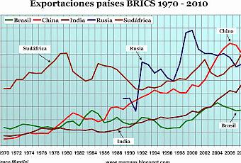 Desde hoy se reunen en Nueva Delhi los líderes de los países BRICS para discutir, entre otras materias, cómo ayudar a Europa a salir de la crisis financiera. La ambiciosa agenda de estos cinco países (Brasil, Rusia, India, China y Sudáfrica) pretende abordar la reforma de las organizaciones internacionales, así como el tema alimentario, los recursos energéticos, la salud y la urbanización. Dado que estos países se han caracterizado por un creciente y sostenido impulso en sus exportaciones (ver gráfica) también viven incertidumbre ante la caída del comercio internacional.
