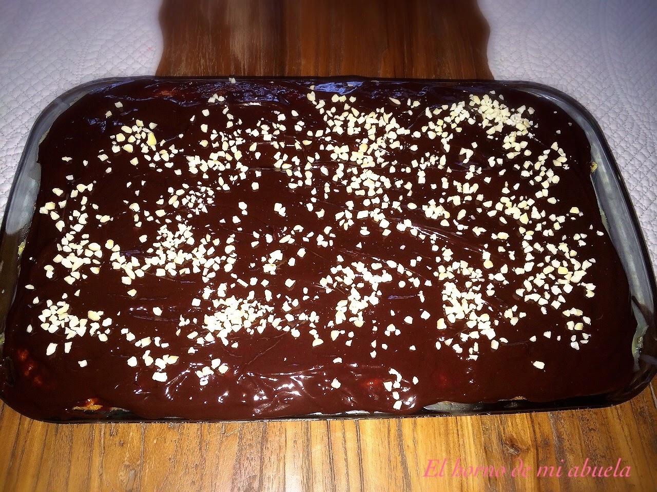 Y por último la cobertura, troceamos el chocolate y lo reservamos. En una cazuela ponemos la nata a calentar y cuando hierva la retiramos y volcamos el chocolate moviendo hasta que se integre bien con la nata. Es mejor prepararla cuando vayamos a usarla porque si no solidifica y es más difícil.Montaje:Cuando el bizcocho esté aún tibio, con el palo de una cuchara de madera, lo agujereamos entero.