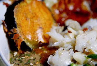 1 bote de lentejas cocidas (yo las preparé con antelación a mi gusto)1 cucharada de kefir1 cucharada de semillas de chia1 cucharada de tahini Sal1 cucharada de aceite de sésamo 1 berenjena Espinacas Parmesano rallado Migas de bacalao 1 diente de ajo EneldoSemillas de sésamo blanco