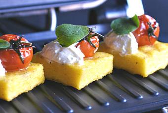 La polenta es un producto muy versátil que ofrece formas varias de preparación y servicio. Es bastante común prepararla con una consistencia más líquida, como de gachas, y comerla con cuchara, aunque también se puede hacer tan sólida como la he hecho para esta receta de polenta al grill con tomates balsámicos y orégano. Un bocado para el aperitivo con el que resulta muy fácil sorprender a los invitados.