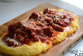 Tradicionalemente la polenta con costillas y salchichas se sirve directamente sobre la mesa, en el centro. Se coloca primero la polenta y luego la carne con su salsa encima. Todos los comensales, con su cuchara, comen directamente de la mesa. Es muy divertido! Para emular un poco esa sensación, yo la suelo servir sobre una tabla de madera. Os recomiendo que lo probéis, a vuestros invitados les encantará!