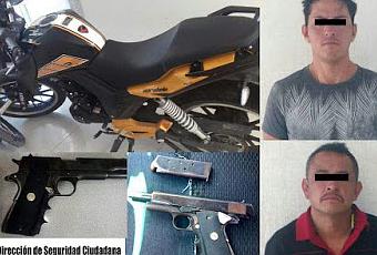 La Fiscalía General de Justicia del Estado de México integró una carpeta de investigación por el delito de robo con violencia en contra dos sujetos presuntos responsables, los cuales fueron capturados por la Dirección de Seguridad Ciudadana y Tránsito de Chimalhuacán en el barrio Canteros.De acuerdo con la investigación, policías municipales de Chimalhuacán recibieron una llamada de auxilio de una víctima que previamente había sido despojada de sus pertenencias en el barrio Hojalateros por dos sujetos que viajaban a bordo de una motocicleta color amarillo.Por lo anterior, personal policial intensificó la búsqueda de los presuntos responsables, quienes intentaron darse a la fuga realizando en diversas ocasiones detonaciones de arma de fuego.Los presuntos responsables fueron detenidos en la avenida Obrerismo (Las Torres) esquina calle Canteros, en el barrio Canteros. Tras una revisión, los uniformados les incautaron un arma de fuego calibre.45 y un cargador con cinco cartuchos útiles.Los detenidos son Gerardo N. y Felipe N., de 42 y 36 años de edad respectivamente, quienes radican en el municipio de Nezahualcóyotl y fueron trasladados a la Agencia del Ministerio Público donde se inició la indagatoria bajo el Número Único de Caso NZ1/062/064512/18/03 por el delito de robo con violencia.El arma de fuego, los cartuchos y la motocicleta fueron puestos a disposición del agente del Ministerio Público, quien continuará con la integración de la carpeta de investigación. En caso de una emergencia, la policía municipal pone a disposición de la ciudadanía el número telefónico 58-53-61-28, el cual opera las 24 horas del día.