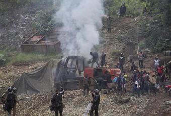 Son rápidamente sometidos con gases lacrimógenos y las autoridades comenzaron a prender fuego al equipo pesado utilizado para extraer oro.