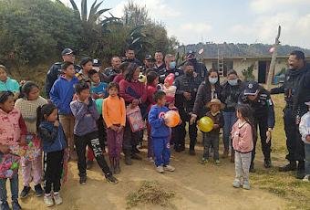 Texcoco, Estado de México. - Policías municipales de Texcoco “armaron la coperacha”, para llevar una sonrisa y abrigo a niños y familias de la colonia Guadalupe Amanalco en la zona de la montaña de Texcoco.