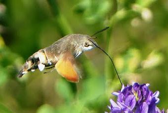 Su comportamiento alimenticio, batiendo las alas a gran velocidad y moviéndose rápidamente de una flor a otra, en las que se nutre de néctar con su larga espiritrompa, llama poderosamente la atención de aquel que no está acostumbrado a verla, que la confunde normalmente con un colibrí. De hecho esta característica de su comportamiento es la que les da su nombre en castellano.
