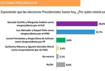 SANTO DOMINGO.– El candidato presidencial del gubernamental Partido de la Liberación Dominicana (PLD) Gonzalo Castillo y su compañera de boleta Margarita Cedeño serían los ganadores de las elecciones del 5 de julio, según una encuesta de la empresa Polimetrics cuyos resultados fueron divulgados este miércoles.De acuerdo a los mismos, Gonzalo y Margarita tienen un 40.4% de la intención de voto, seguidos de Luis Abinader y Raquel Peña del opositor Partido Revolucionario Moderno (PRM), quienes acumulan 37.7%. La diferencia entre unos y otros es de 2.7%.