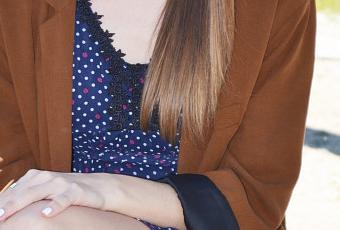 El blazer que llevo, de la nueva colección de Zara, es una prenda que todas deberíamos tener de fondo de armario, una americana oversize en color marrón, perfecta para combinar con infinidad de estilos y looks. Para este conjunto, la he combinado con un vestido azul marino muy preppy de estampado polka dots o los lunares de toda la vida.