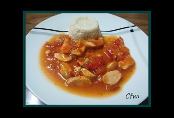 -8 solomillos de pollo troceados-1 pimiento rojo -1 cebolla-3 tomates maduros-3 dientes de ajo-Aceite de oliva-1 hoja de laurel-Sal-Pimienta