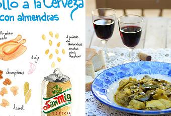 Ingredientes; 1 Pollo troceado, 1 puñado de almendras al natural, Ajo, Chanpiñones (opcional), 1 lata de cerveza, lairel, sal, pimienta, azafrán en hebra, Aceite de oliva Virgen de la Cooperativa San Juan Bautista de Aldeahermosa de Montizón.