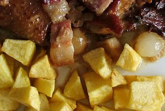 Elaboración En primer lugar salpimentamos el pollo con sal de ajo y pimienta. Lo doramos en una sartén con un buen chorro de aceite de oliva. Una vez dorado, lo reservamos. Pelamos la cebolla y la picamos en trocitos pequeños y lo mismo hacemos con los dientes de ajo. Colamos el aceite donde hemos dorado el pollo y en él rehogamos la cebolla y los ajos con un poco de sal durante un par de minutos, hasta que la cebolla se ablande y se ponga de color ligeramente transparente. Añadimos el bacon, que previamente habremos cortado en tiras, y lo dejamos al fuego durante un par de minutos. Agregamos el pollo, las cebolletas e incorporamos la cerveza y la nata. Dejamos a fuego hasta que empiece a hervir. A continuación volcamos todo en una bandeja refractaria y lo metemos en el horno a 200º C durante aproximadamente media hora, dándole la vuelta a al pollo a los 15 minutos para que no se seque.