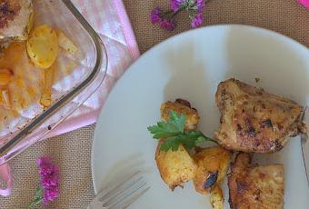 4. Colocamos las patatas sobre una fuente apta para el horno y sobre ellas el pollo y lo horneamos unos 45 minutos, hasta que la carne y las patatas estén hechas.