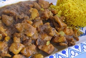 - Trocear 1 kg de contramuslos de pollo en trozos pequeños, salpimentar y añadir 2 cuch. de ras el hanout, mezclándolo todo bien.