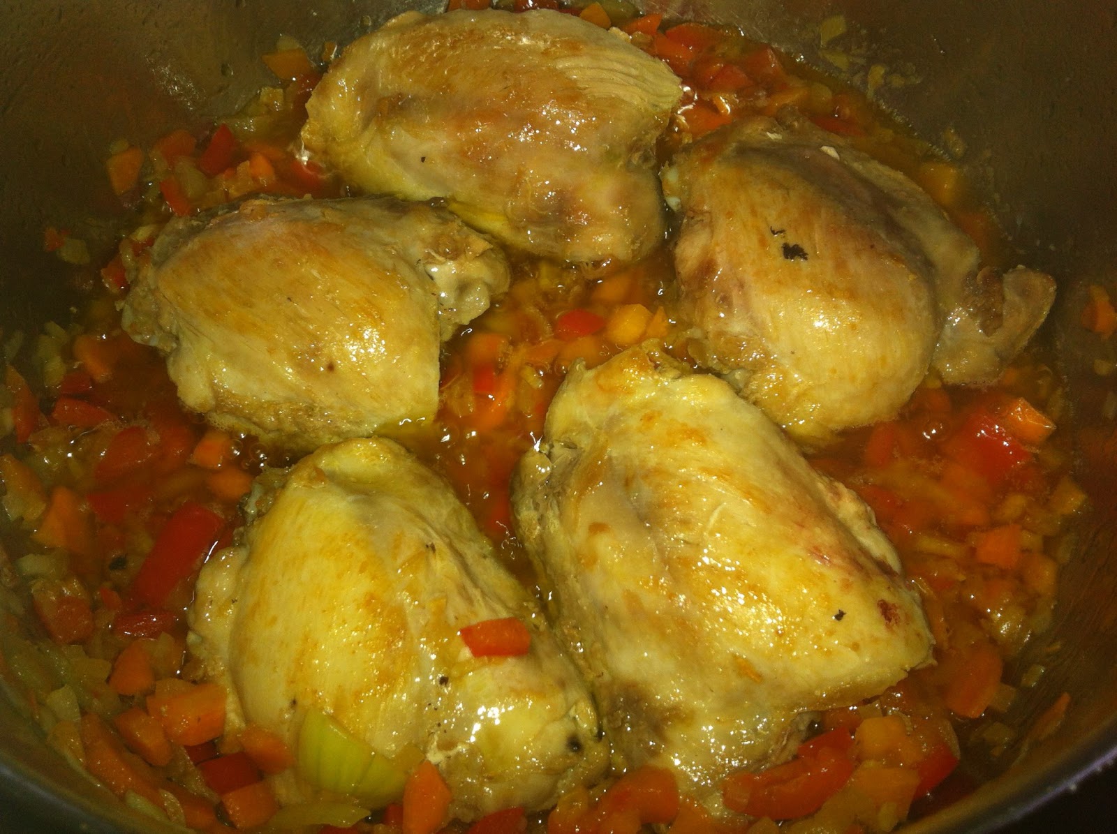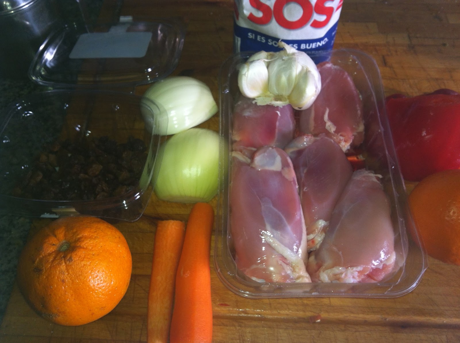 1 kg de contramuslos de pollo 1 l de zumo de naranja 2 cebollas grandes o 4 pequeñas 1 ajo, aceite, pimienta, sal, pasasUnas zanahorias, pimiento rojo