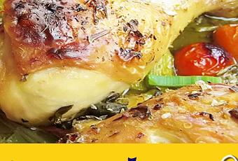 Tomates, alcaparras y orégano le dan a este pollo asado un delicioso aroma y sabor. Se puede usar esta receta para preparar pechuga; yo he preferido utilizar los muslos porque son más jugosos y económicos. El pollo se puede asar con piel, pero habremos de retirarla en el momento de servir.