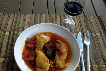 Hace ya bastantes semanas, un grupo de amigas decidimos hacer una jornada gastronómica dedicada a La Rioja. Enseguida empezamos a pensar en toda la riqueza culinaria de esa región, y cada una fue escogiendo alguno de esos platos. Mi elección primera había sido otro plato, pero tuve que desestimarle porque un viaje precipitado me impidió poder ir a comprar los productos necesarios, que no son fáciles de conseguir en mi barrio (manitas y tripa de cordero), así que al final me incliné por este pollo con sabor riojano que se prepara en casa de toda la vida, y que podemos elaborar de forma sencilla con ingredientes que solemos tener en casa. Podéis usar un pollo troceado, o como yo, la parte del pollo que más os guste. A mí me encantan los contramuslos porque son muy jugosos. Las cantidades son más o menos para seis personas. Vamos con la receta y el paso a paso.