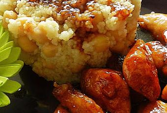 Servimos el cous cous y los garbanzos acompañados del pollo y salseando por encima.