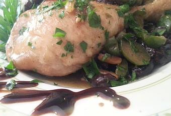 2 partes de pollo (jamoncitos y pechuga), 1/3 de cebolla, piñones, aceitunas negras, aceitunas verdes, caldo vegetal, brandy o vino blanco, perejil, pimienta, sal y aceite.