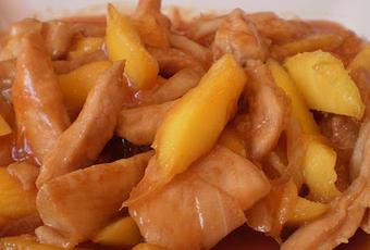 Incorporar los ajos machacados y la cebolla y saltear durante dos o tres minutos, añadir los trozos de mango, la mezcla de la salsa agridulce y la harina de maíz previamente diluida en agua.