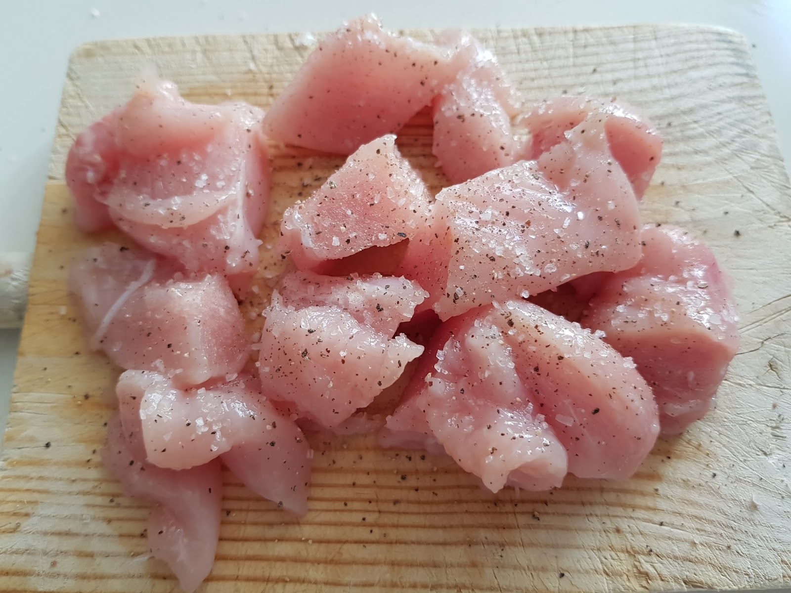 2. - Mientras se hacen los ajos, troceamos la pechuga en dados, no muy grandes, y salpimentamos.