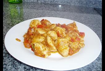 Elaboración:1. Ponemos a calentar una hoya con un chorrito de aceite de olivo y añadimos el pollo salpimentado.2. Cuando el pollo este dorado lo reservaremos y en la misma hoya añadiremos la cebolla, el ajo y el pimiento rojo (cortado en brunua (cuadraditos)).3. Ponemos un cazo con abundante agua a calentar, cuando rompa a hervir meteremos iuno a uno los tomates con dos cortes circulares lo tendremos un minuto y lo sacaremos (con este proceso le podremos quitar la piel fácilmente (esto se llama escaldar).4. Cuando la cebolla y el pimiento este pochado le añadiremos el tomate (cortados en pedazos), un poco de sal y una cucharada pequeña de azúcar lo dejaremos unos 10 minutos.5. Transcurrido los 10 minutos le añadiremos el pollo, las dos hojas de laurel y el vino blanco esto tardara unos 30 minutos. (Esperaremos que reduzca hasta que se queda una salsa).