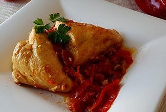 Hoy tocó pollo... y todos encantados, porque es un alimento que nos gusta mucho y preparado de esta forma... muchísimo! De hecho es una receta habitual en nuestros menús.La receta la descubrimos hace ya unos cuantos años en un viaje por tierras aragonesas, justamente por estas fechas... estuvimos visitando la ermita de San Juan de la Peña (las fotos eran todavía analogicas y están por ahí en alguna caja), hacía mucho frío, y de camino a Jaca encontramos un restaurante en una casa típica del Pirineo con una chimenea tradicional enorme... nunca olvidé aquel calorcito tan acogedor! Y que gustazo disfrutar de aquel pollo al chilindrón que nos sirvieron... así incorporamos esta forma de preparación a nuestro recetario habitual y ahí permanece desde hace veinte y muchos años... a ver si os gusta!