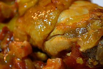 Añadimos entonces el tomate triturado o tomate entero troceado, el pimentón y dejamos cocer a fuego medio unos 5 minutos. Transcurrido este tiempo, añadimos el pollo con el jamón que habíamos reservado anteriormente, salpimentamos y dejamos cocer a fuego lento aproximadamente unos 10 minutos. Añadimos entonces el vino y dejamos cocer a fuego lento unos 25 minutos o hasta que el pollo este tierno.