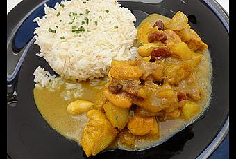 Ingredientes (2p): 1/2 pechuga de pollo, 1 cebolla, 1 manzana, 1 plátano, 200grs de arroz basmati, 300ml caldo, 50grs pasas, 50grs almendras fritas, 1 cucharada sopera de curry en polvo, 1 cucharada sopera de aceite de sésamo, 50ml nata líquida, 50grs miel, sal, pimienta y aceite de oliva.