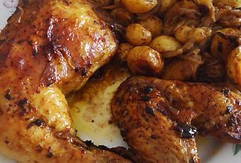 5. Servir el pollo acompañado por las patatas y la cebolla, bañar con un poco de jugo.