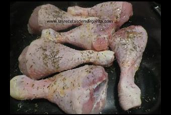 Mientras, lavamos los muslitos y los ponemos en una fuente de horno, salpimentamos. Regamos con un chorro de aceite y espolvoreamos tomillo. Asamos durante 30 min. en el horno. Pasado este tiempo damos la vuelta 15 minutos más.