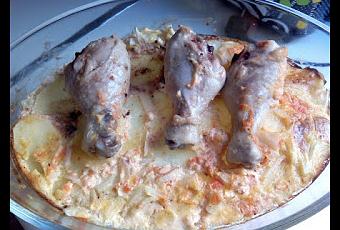 Elaboración:Limpiamos los muslos de pollo y sal pimentamos. Rallamos los tomates, cortamos la cebolla y pelamos y troceamos las patatas.Ponemos las patatas y la cebolla en el fondo de la fuente de horno, colocamos los muslitos encima y le echamos el tomate rallado. Hacemos el ali oli con la batidora y volcamos encima de todos los ingredientes. Desmenuzamos el cubito de caldo, añadimos medio vaso de agua y horneamos 180º durante 45 minutos y ya está listo para comer.