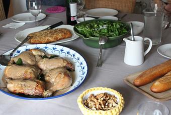 Precalentar el horno a 220 grados. Meter la fuente en el horno. Los primeros 15 minutos dar la vuelta cada 5 minutos al pollo y regarlo con un poquito de caldo y el fondo de la fuente. Después, bajar el horno a 175 grados. Y dar la vuelta un par de veces más, regándlo con cada vuelta. Cuando está hecho, retirar el pollo y triturar la salsa. Corregir de sal y servirla con el pollo. Como sale bastante salsa, sírve el resto de la salsa en una salsera. No te olvides del pan, ¡no digas que no te he avisado! Bon appetit!
