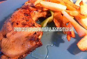 INGREDIENTESUn pollo de 2 kg., un limón, una pastilla de caldo de pollo (opcional), 500 gr. patatas, 4 dientes de ajo, una hoja de laurel, perejil, tomillo, romero, pimienta negra, 150 ml. aceite de oliva, sal.