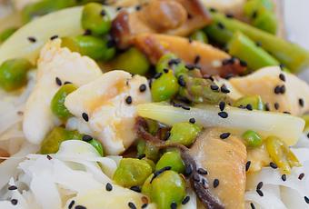 400 gr. de filetes de pollo1 clara de huevosal y pimienta negra1 cucharadita de fécula de patata o (harina de maiz)2 cebollas2 dientes de ajoun puñado de guisantes peladosun puñado de espárragos triguerossetas (yo las he utilizado deshidratadas)el zumo de un limón100 gr. de caldo de ave o de verduras2 cucharadas de salsa de soja4 cucharadas de aceite de sésamo2 cucharadas de vino de arroz200 gr. de fideos de arroz1 guindilla (opcional)dos cucharaditas de sésamo negro