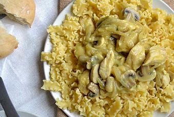 ½ Pechuga de pollo en trozos grandes.1 Cebolla pequeña.10 Champiñones.2 Cucharadas colmadas del sobre de crema de espárragos de Knorr.2 Cucharadas de salsa de mostaza.2 Cucharadas de zumo de limón.Sal, pimienta y aceite.200 gr. de mafalda corta de Garofalo para acompañar (o pasta corta al gusto)