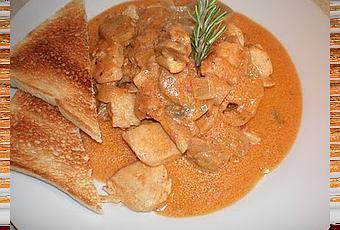 Ingredientes (2p) 3-4 filetes de pechuga de pollo, 1 cebolla, 2-3 cucharadas de salsa de tomate, 1 lata de champiñones laminados, 1 cucharada sopera de mostaza, 1 copita de whisky, 100ml de nata agria, aceite, sal y pimienta.