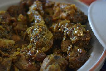 Pon un cazo con aceite para dorar las cebollas, una vez listas, reserva. En otro sartén pon suficiente aceite para dorar los jamoncitos de pollo teniendo cuidado que no se hagan demasiado. Introduce en una cacerola grande o una olla tahine el pollo y las cebollas previamente dorados, echa a continuación las especias y sal. Remueve, agrega el tamarindo y la miel, remueve. A continuación, vierte la cantidad de agua hirviendo necesaria para cubrir el contenido, pon a fuego medio y después de unos 15 minutos pon a fuego bajo hasta que completes aproximadamente hora y media, sin dejar de remover a menudo para evitar que se pegue.