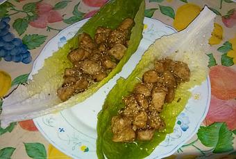 Finalmente servir el pollo sobre las hojas de lechuga bien lavadas, agregar el aguacate cortado en cubos ( que como podéis comprobar no figura en la foto , ya que se me olvido al hacerlas ) sobre éste, las semillas de sésamo