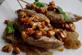 1- Troceamos las pechugas, las ponemos a macerar con las especias y las hierbas un par de horas antes de cocinarlas. 2- En una sartén con un poquito de aceite, sofreímos la cebolla, cuando comience a dorarse añadimos el pollo y freímos hasta que comience a estar bien hecho por dentro. Salpimentamos y añadimos un vasito de caldo de pollo. Dejamos reducir a fuego lento, unos 15 min.3- En un cazo tostamos las almendras con la mantequilla, cuando comiencen a dorarse añadimos la miel y removemos bien. Servimos el pollo decorado con las almendras y un poco de cilantro picado.