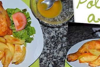 Ingredientes:2 Piernas de pollo, 1/2 limón, 2 dientes de ajo, Aceite de oliva, 3 patatas, 1/4 vaso vino blanco.